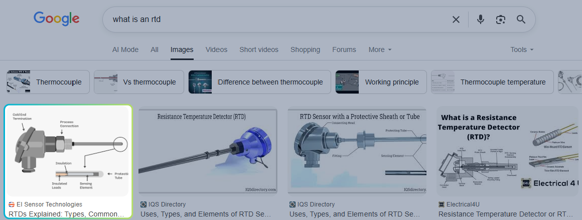 That query had strong search volume, clear informational intent, and high relevance to EI Sensor’s products. So we developed a blog post that answered the question thoroughly, but in plain, helpful language. Alongside that content, we created a custom RTD infographic, something visually clean and technically accurate that would support the explanation and stand out in image results.