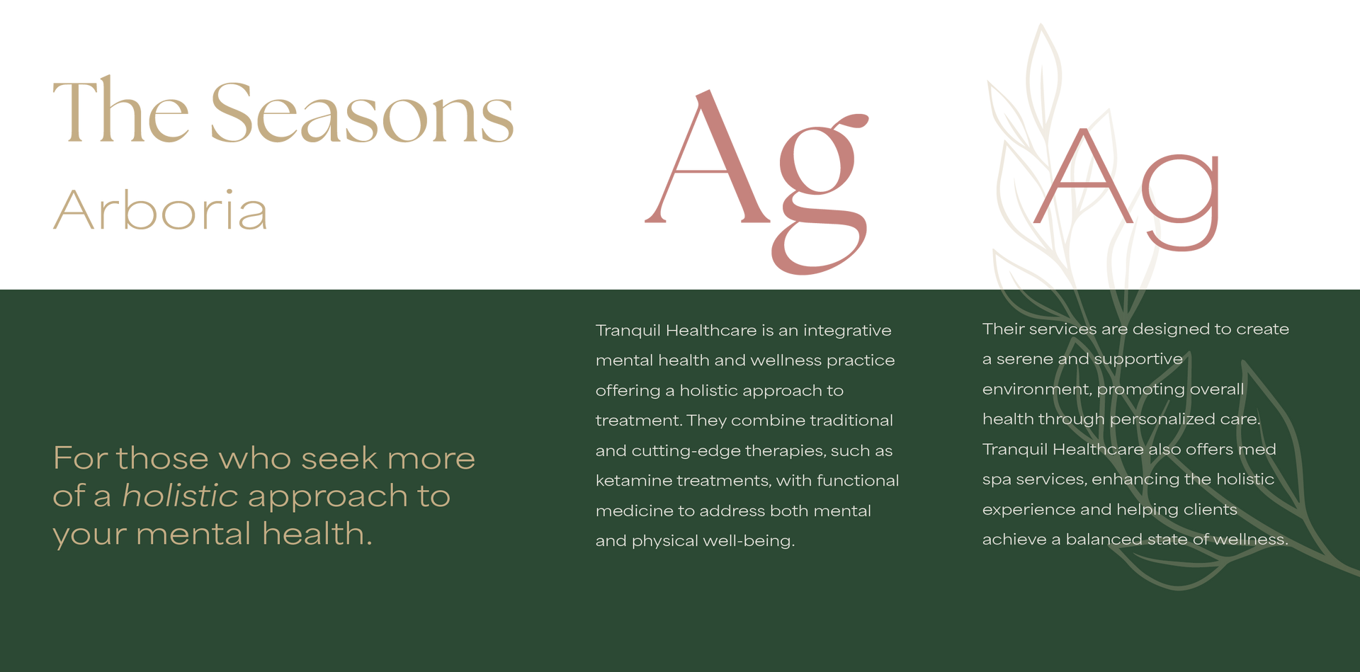 The Seasons font was an ideal choice for the main headers, as its elegant, organic serifs perfectly align with the brand's refined aesthetic. The typeface exudes a sense of timeless sophistication, which complements the overall branding. Paired with Area Extended, the design achieves a harmonious balance, as the rounded forms of Area Extended resonate with the brand’s elements, adding a touch of modernity while maintaining cohesiveness.